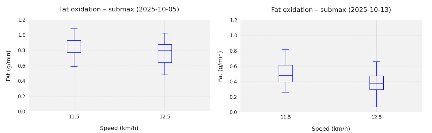 - large improvement in fat oxidation across the board, including moderate intensities at which I race e.g. a 50 km (just above LT1)