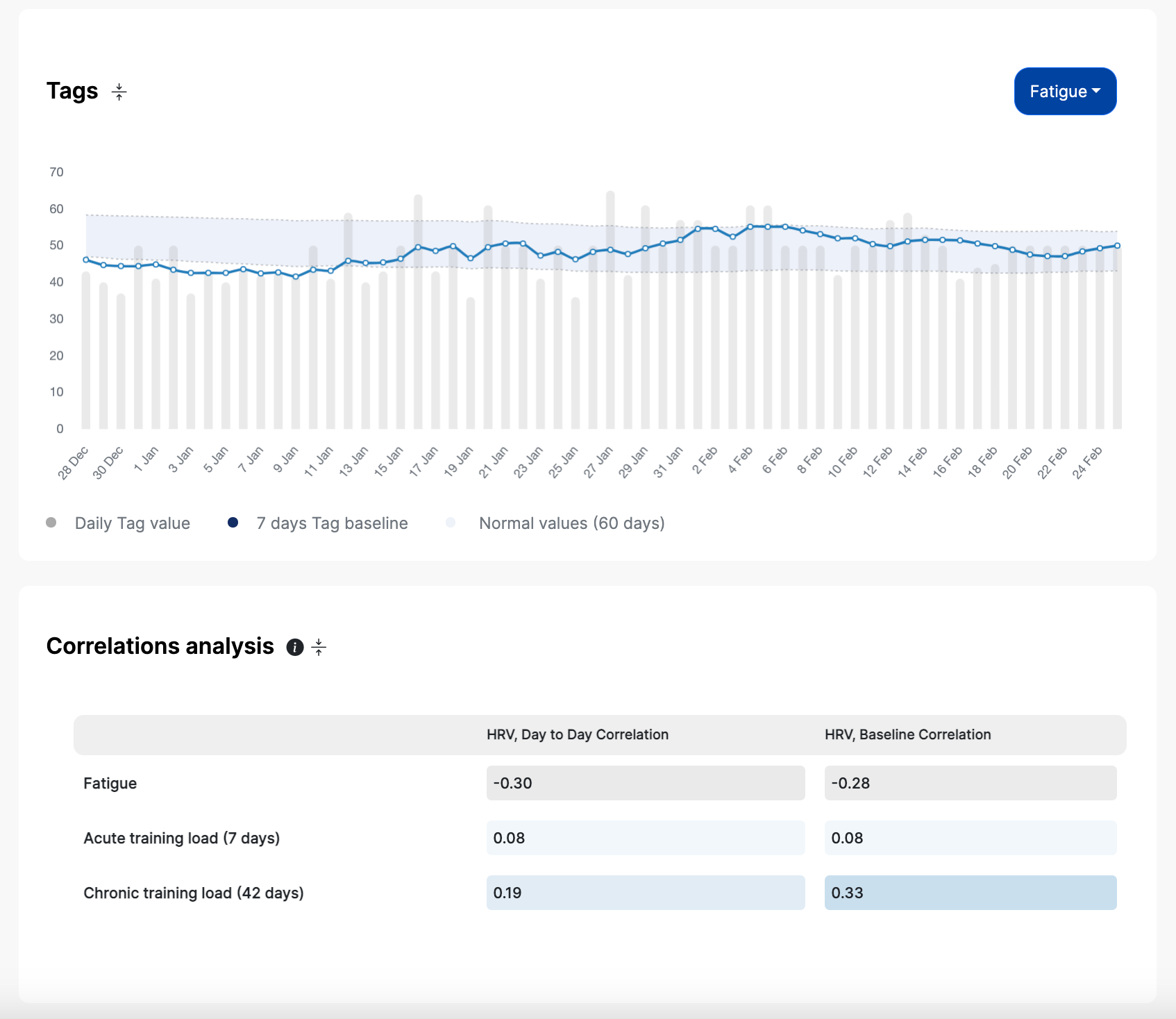 For example, in the Dashboard, you can pick up to 6 parameters, including physiological data, and subjective annotations, and compare the recent week with respect to your previous month.